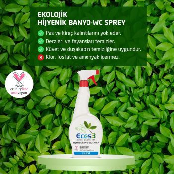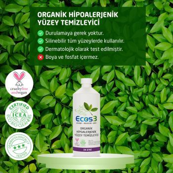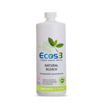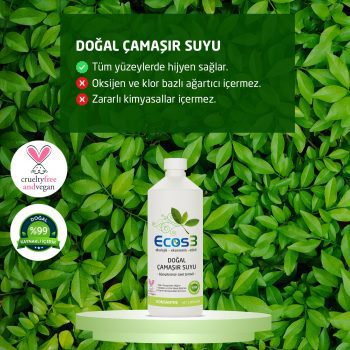 How to use: With its strong formula, it is poured into the bathroom, toilet bowl, sink holes and the surfaces are wiped and rinsed after waiting 4-5 minutes. Odor and stains in the environment are removed and hygiene is provided. To clean and hygiene surfaces, 60 ml (1 tea glass) is added to 5 liters of water and wiped. Kitchen cloths, sponges, yellowed spoons, cups, and glasses are pressed into water with Ecos3 Natural Bleach and both cleaning and hygiene are provided. Suitable for hand and machine use for laundry. To whiten white laundry, add 60 ml (1 tea glass) Ecos3 Natural Bleach to 5 liters of water and wash.